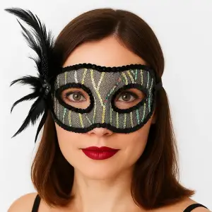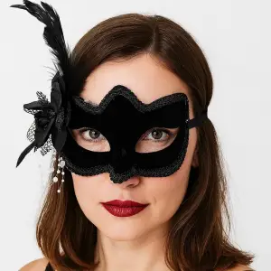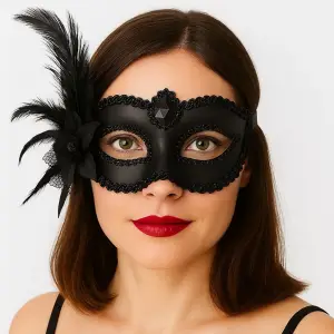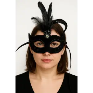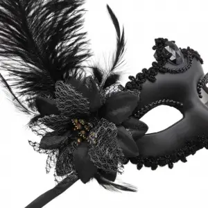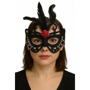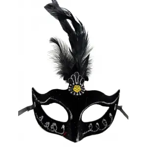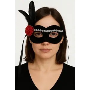 Siyah Mat Renk Yandan Tüylü Güllü Parti Balo Venedik Maskesi 16x22