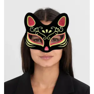 Siyah Renk Süet Kaplama Üzeri Kırmızı Sarı Simli Kedi Maskesi 17x14 cm
