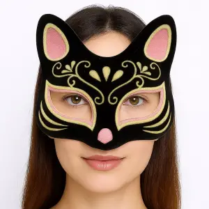 Siyah Renk Süet Kaplama Üzeri Pembe Sarı Simli Kedi Maskesi 17x14 cm
