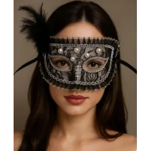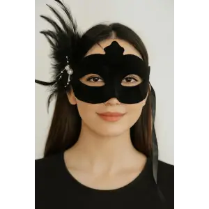 Siyah Renk Yandan Tüylü Süet Kaplama Beyaz İncili Parti Maskesi 18X15 cm