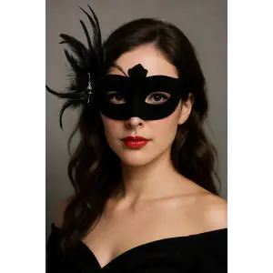 Siyah Renk Tüylü Siyah Süet Kaplama Parti Balo Maskesi 20X16 cm