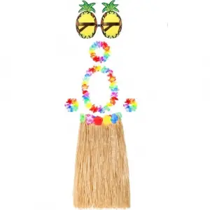 Hawaii Parti Kostüm Seti - 60 cm Hasır Etek, Çiçekli Aksesuarlar ve Ananas Gözlük