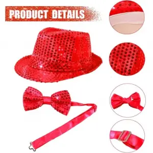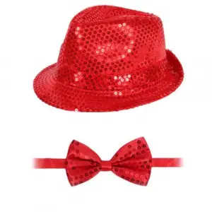 Kırmızı Payetli Şapka ve Papyon Seti – Parıltılı Yetişkin Kostüm Seti