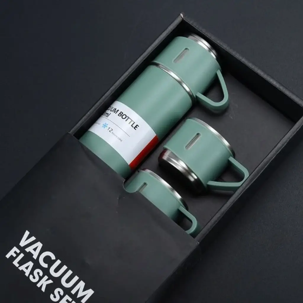PASLANMAZ ÇELİK BARDAKLI TERMOS SETİ 500 ML.Ürün ÖzellikleriTutma kulp sayesinde kolayca taşınır.3 adet bardağı mevcuttur.2 katmanlı hassas teknoloji, ısı ve soğuk yalıtımlıdır. Kaydırmaz taban özelliği ile her zemine güçlü tutuş sağlar.12 saat sıcak ve soğuk tutma özelliğine sahiptir.500 ML kapasitesi mevcuttur.304 paslanmaz çelik kalitesi. Ürünün Ebatları:24 cm x 6,6 cm (bardak kulpu dahildir.) Paket İçeriği1 adet paslanmaz çelik bardaklı termos seti 500 ml.