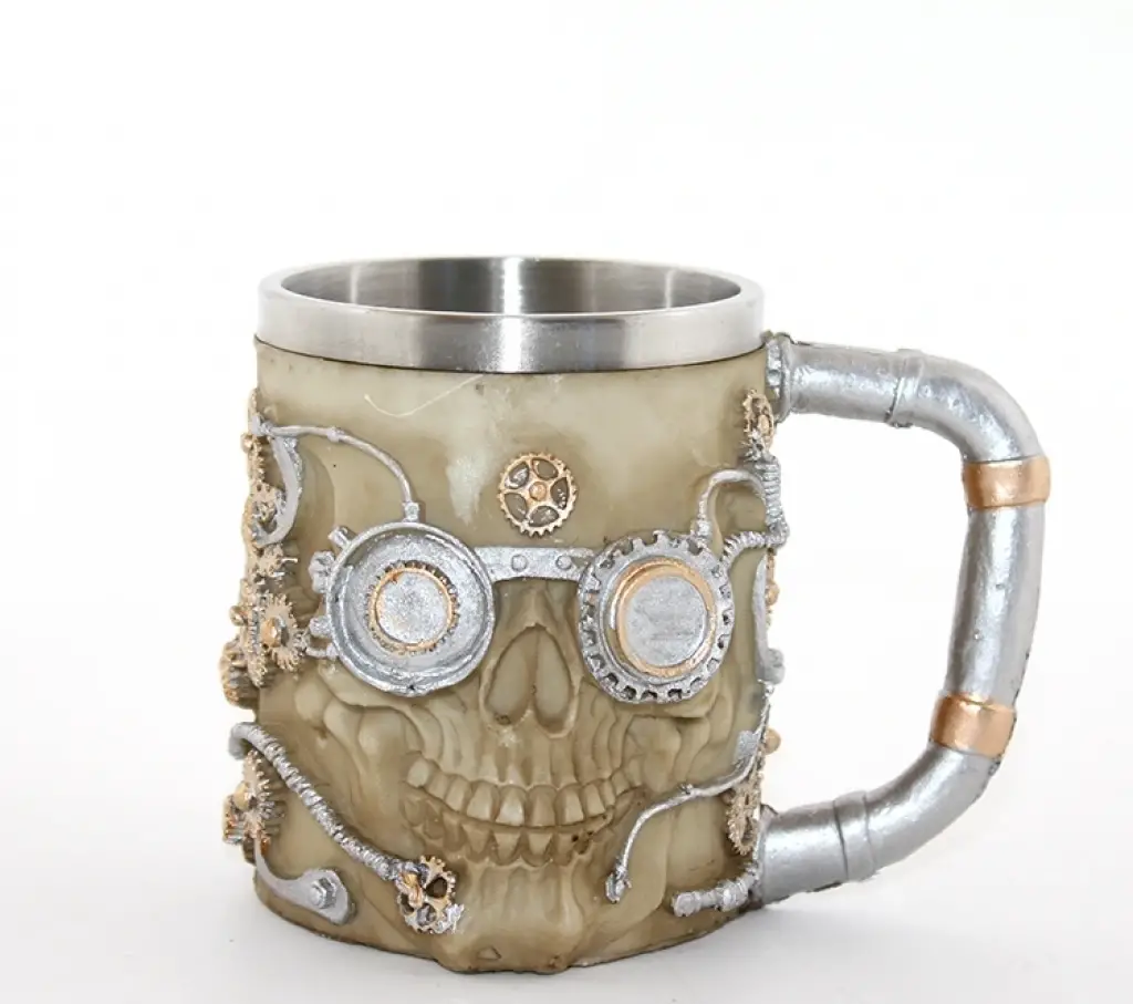 PASLANMAZ ÇELİK KUPA BARDAK MODEL 2Ürün ÖzellikleriPaslanmaz Çelik Kupa Bardak Model 2, kuru kafa ve steampunk detaylarıyla dikkat çeken bir içecek aksesuarıdır. Yüksek kaliteli paslanmaz çelik malzemeden üretilmiştir, sıcak ve soğuk içecekleri uzun süre muhafaza eder. Kuru kafa ve steampunk dişli süslemeleri, gotik ve endüstriyel bir hava yaratırken, kupayı eşsiz ve benzersiz bir parça haline getirir. Hem dekoratif bir masaüstü aksesuarı hem de işlevsel bir kupa olarak kullanılabilir. Koleksiyon severler ve steampunk teması sevenler için ideal bir seçimdir.Paket İçeriği1 adet Paslanmaz Çelik Kupa Bardak Model 2