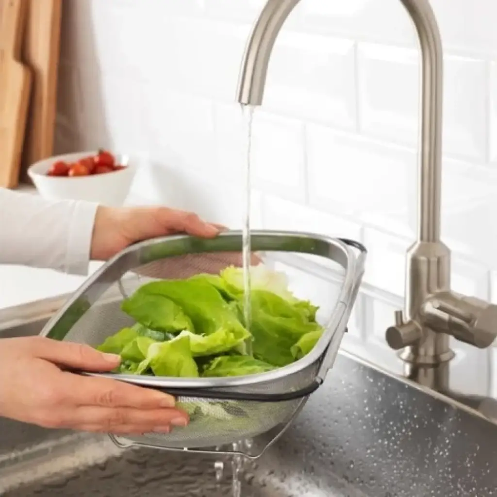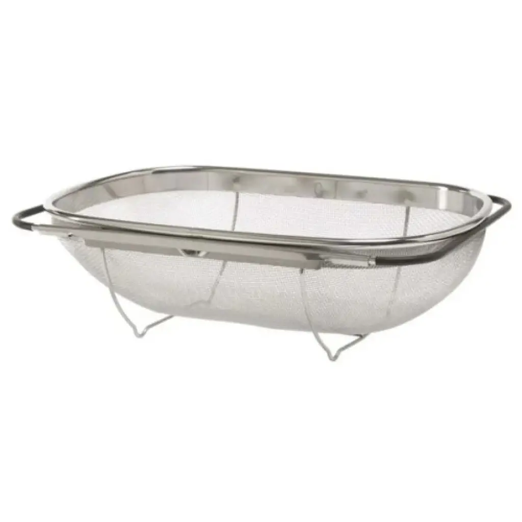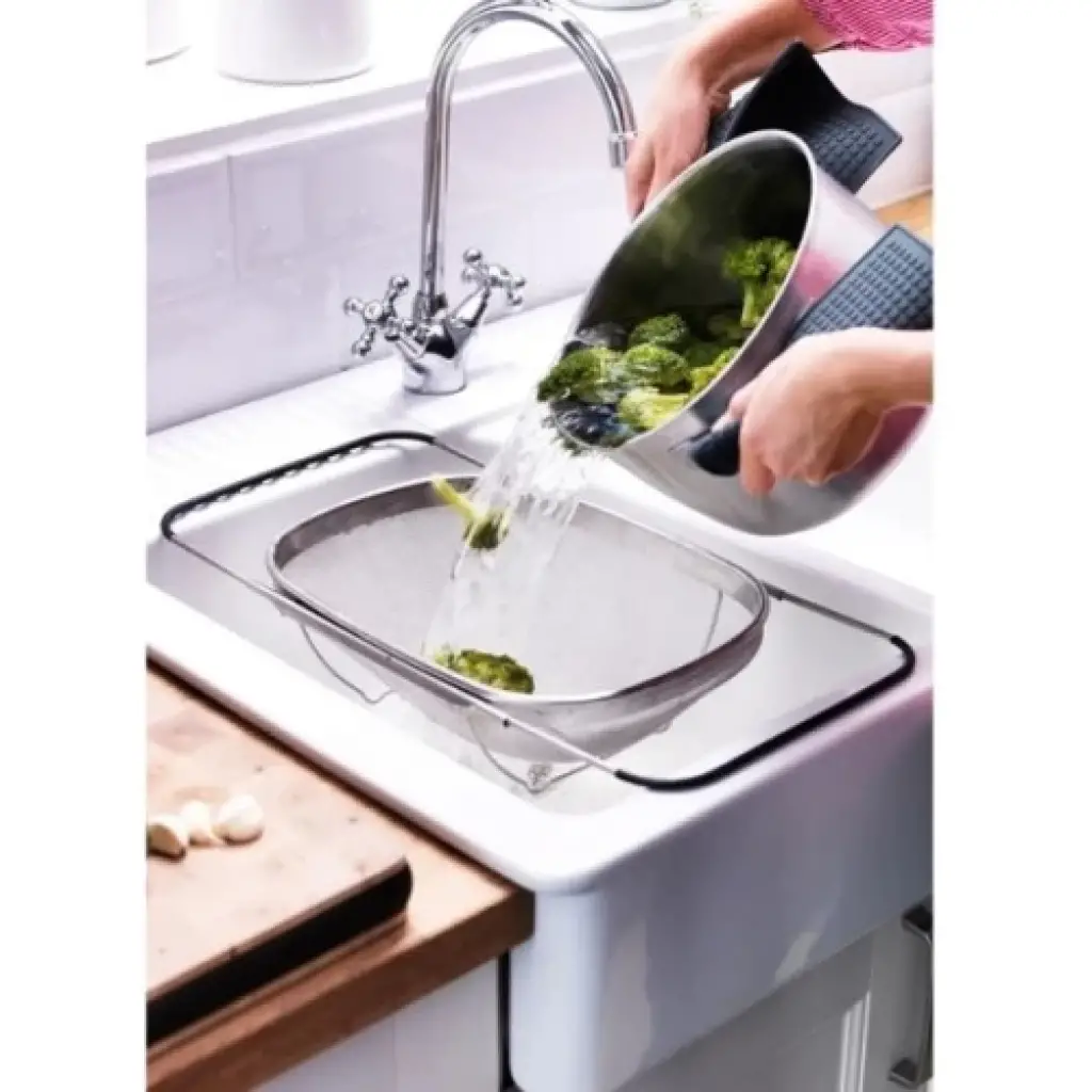 PASLANMAZ ÇELİK TELESKOPİK SÜZGEÇÜrün ÖzellikleriPaslanmaz çelik teleskopik süzgeç, meyve, sebze, makarna gibi yiyecekleri yıkamak veya süzmek için kullanılır. Dayanıklı paslanmaz çelik yapısı uzun ömürlüdür ve etkili süzme sağlar. İnce delikli tel örgü yapısı sayesinde küçük parçaların kaçmasını önler. Teleskopik açılıp kapanabilir yan kolları, süzgecin lavabo üzerine kolayca yerleştirilmesini sağlar ve farklı lavabo genişliklerine uyum gösterir. Süzgeç, katlanabilir ayakları sayesinde yerden yükseltilerek daha hijyenik kullanım sunar. Hem ev tipi mutfaklar hem de profesyonel mutfaklar için uygundur.Paket İçeriği1 Adet Paslanmaz Çelik Teleskopik Süzgeç