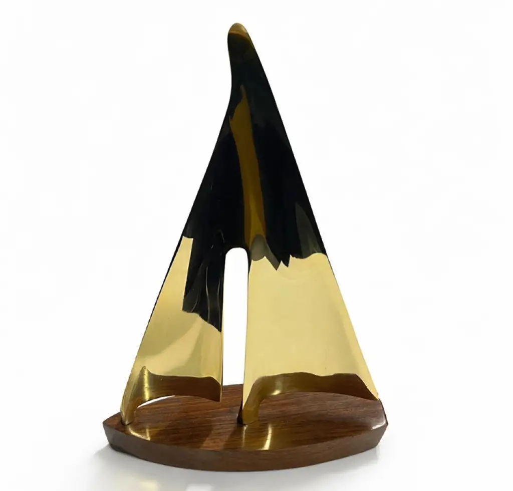 PİRİNÇ YELKEN GEMİÜrün ÖzellikleriPirinç Yelken Gemi, denizlerin özgür ruhunu ve modern sanatın zarif hatlarını bir araya getiren prestijli bir dekorasyon objesidir. 23x15 cm boyutlarındaki bu özel tasarım, soyut yelken formu ve aynalanmış yüzeyi ile bulunduğu ortama sofistike bir derinlik katar. Pirinç görünümlü kaliteli malzeme kullanımı sayesinde elde edilen parlak altın tonları, ışığı mükemmel şekilde yansıtarak çalışma masanıza veya rafınıza lüks bir dokunuş sağlar. Ürünün altında yer alan dairesel ahşap stand, metalin ışıltısı ile doğal dokunun kusursuz uyumunu sunarken biblonun dengeli ve şık bir şekilde sergilenmesine olanak tanır. Bu dekoratif yelkenli biblosu, minimalist ve çağdaş dekorasyon stilleriyle harika bir uyum yakalarken marin temalı mekanlar için de vazgeçilmez bir tamamlayıcıdır. Hem deniz tutkunları hem de vizyon sahibi sevdikleriniz için unutulmaz bir hediyelik eşya seçeneği olan bu parça, kaliteden ödün vermeyen bir işçiliğe sahiptir. Estetik ve dayanıklılığı buluşturan bu pirinç yelkenli, ofis ve evlerinizde dikkatleri üzerine çeken en şık dekoratif aksesuar modellerinden biridir.Ürün Teknik ÖzellikleriÖzellikAçıklamaÜrün AdıPirinç Yelken GemiBoyut23x15 cmMalzemePirinç Görünümlü Kaliteli Metal ve Ahşap KaideTasarımModern Soyut Yelkenli FormuRenkParlak Pirinç / Antik Gold ve KahverengiStilModern / Marin / Minimalist DekorasyonKullanım AlanıOfis, Çalışma Odası, Salon, VitrinPaket İçeriği1 Adet Pirinç Yelken Gemi