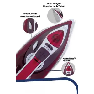 Yeni Nesil Kırmızı Buharlı Ütü 2200 Watt Seramik Tabanlı Yüksek Buhar Gücü