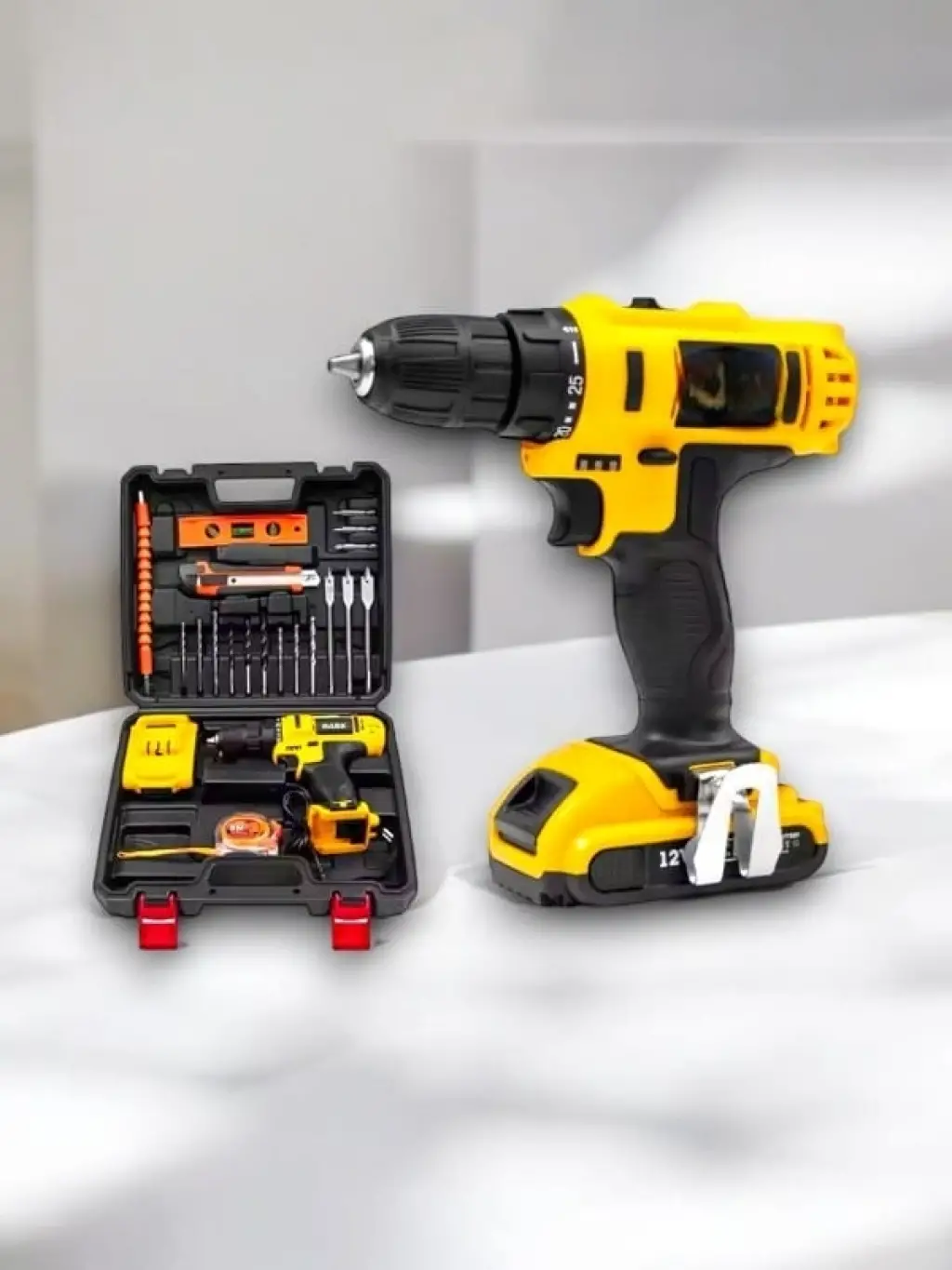 Profesyonel Matkap Seti 24w çift bataryalı metal şanzıman darbeli 27 parçalı süper setli Otomatik mil kilidi işlevi Dahili yüksek hassasiyetli rulman ile metal vites kutusu Ileri Geri, değişken hız ve elektrikli fren Led çalışma ışığı ve akıllı batarya göstergesi Hızlı şarj adaptörü ile 30 dakikada içinde tam dolum Daha az yorgunluk ve daha fazla konfor için ergonomik tasarım 24 parça aksesuar 1 adet akrobat spiral 1 adet uzatma atı 1 adet lokma bağlantı atı 5,6,7,8,9,10,11,12,13 mm lokma ucu 6 adet bits vidalama ucu 3 adet hss metal 3 adet ahşap delme ucu