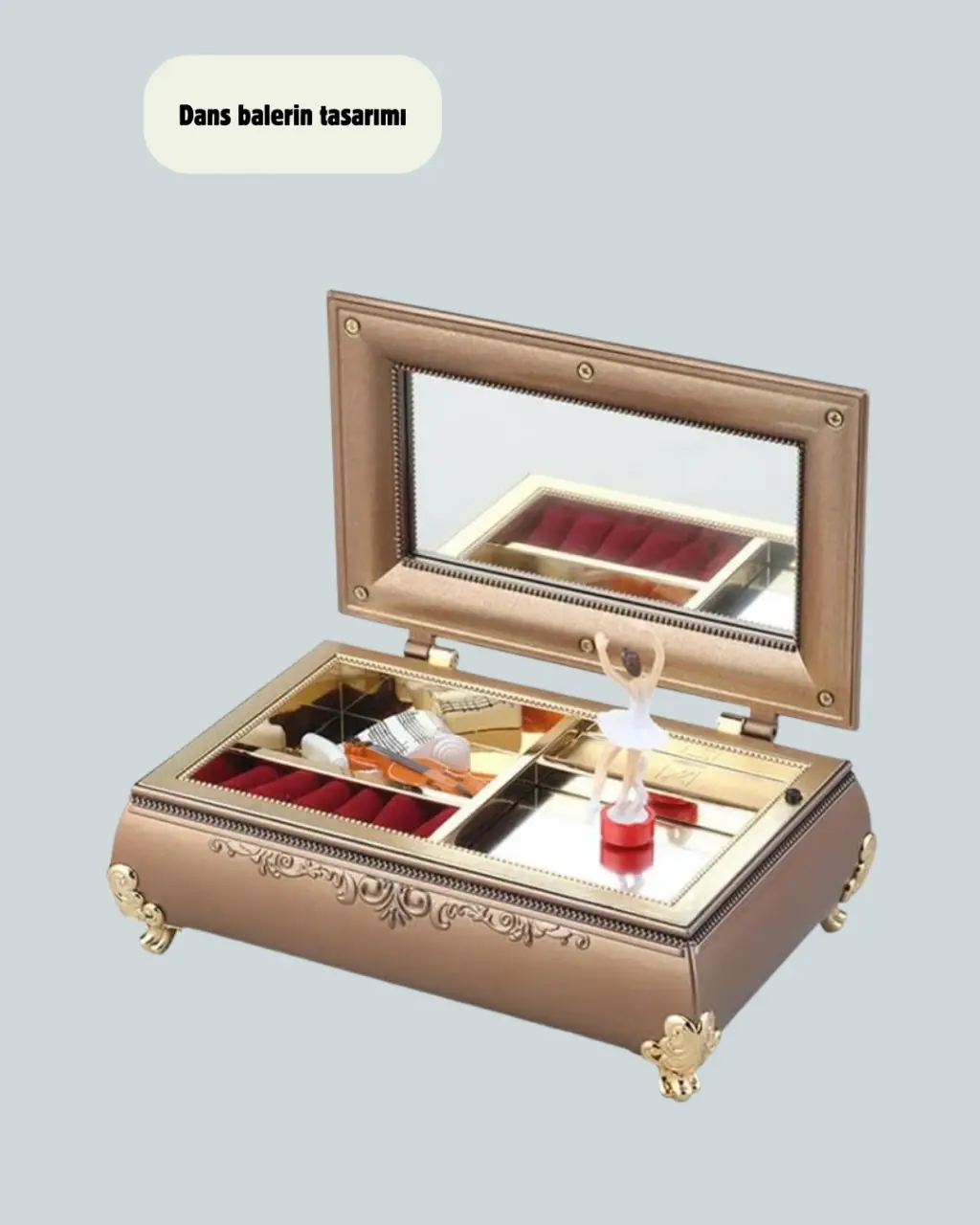 Balerinli müzikli takı kutusu, şık piyanovari tasarımı ile hem görsel hem işlevsel açıdan zengin bir üründür. Fırınlama boya tekniği sayesinde yüzeyi dayanıklıdır ve uzun süre yeni görünümünü korur. Parlak beyaz veya pastel tonlara sahip olması, ürünü özellikle kız çocuklarının odalarında romantik bir dekor haline getirir.Kutunun iç kısmında balerin figürü yer alır. Müzik başladığında bu figür eşliğinde oluşan görüntü, masalsı bir hava yaratır ve ürüne benzersiz bir karakter kazandırır. Melodi, ortamda hoş bir atmosfer oluşturur ve ürünü sadece bir takı kutusu olmaktan çıkarıp duygusal bir obje haline getirir.Takı kutusu içinde bulunan bölmeler yüzük, bileklik, küpe ve kolye gibi aksesuarların düzenli bir şekilde saklanmasına imkân tanır. Bu sayede hem es bir kutu elde edilir hem de takılar kaybolmadan düzenli biçimde korunur.Ürün hediye olarak verildiğinde de çok beğeni toplar. Bale ve müzik seven kız çocukları, genç kızlar veya nostaljik ürünleri seven yetişkinler için ideal bir armağandır. Özel günlerde kalıcı bir anı oluşturmak isteyenler için etkileyici bir tercihtir.Piyano formundaki dış tasarım; makyaj masası, komodin, raf ve vitrin gibi alanlarda dekoratif bir obje olarak kendini gösterir. Es çizgileri sayesinde yaşam alanına sanatsal bir dokunuş katar.Balerinli müzikli takı kutusu, hem tasarımının romantik havası hem işlevsel kullanım avantajlarıyla, her yaş grubuna hitap eden çok özel bir üründür. Hem şıklığı hem düzen sağlama işleviyle yaşam alanlarını güzelleştirir ve unutulmaz bir hediye seçeneği oluşturur.