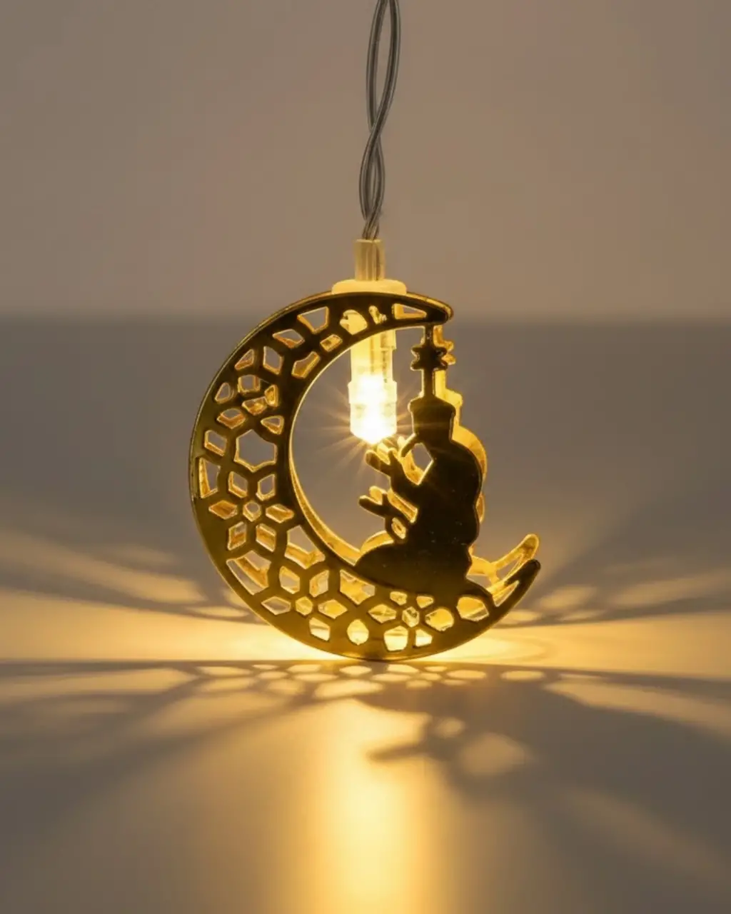 Secde eden adam silüetli ay tasarımıyla öne çıkan Ramazan LED peri ışığı, dekorasyonunuza hem estetik hem de manevi bir dokunuş katar. Ay formu içerisinde yer alan insan silüeti, dua ve teslimiyet temasını simgelerken sıcak LED ışıkla birleşerek huzur veren bir görüntü oluşturur. Metal kesim detayları ışığın gölge oyunlarını daha belirgin hale getirir.Günışığı sarı LED rengi, Ramazan ayına uygun sıcak ve samimi bir ambiyans yaratır. İftar sofralarında, salon ve oturma alanlarında, çocuk odalarında veya vitrin süslemelerinde dekorasyonu tamamlayıcı bir unsur olarak kullanılır. Loş ortamlarda dahi ışık dağılımı dengelidir ve göz yormaz.Pilli yapısı sayesinde kablo karmaşası olmadan kolay kullanım sağlar. Priz ihtiyacı olmadan her alana uyum sağlar ve taşınabilirliği ile öne çıkar. Halı üstünde, masa üzerinde veya duvara asılarak farklı dekorasyon stillerine uyum sağlar.Ramazan temalı LED peri ışığı; ev dekorasyonu, özel gün süslemeleri ve manevi anlam taşıyan hediyeler arayanlar için ideal bir tercihtir. Hem şık hem anlamlı yapısı sayesinde Ramazan boyunca keyifle kullanılabilir.