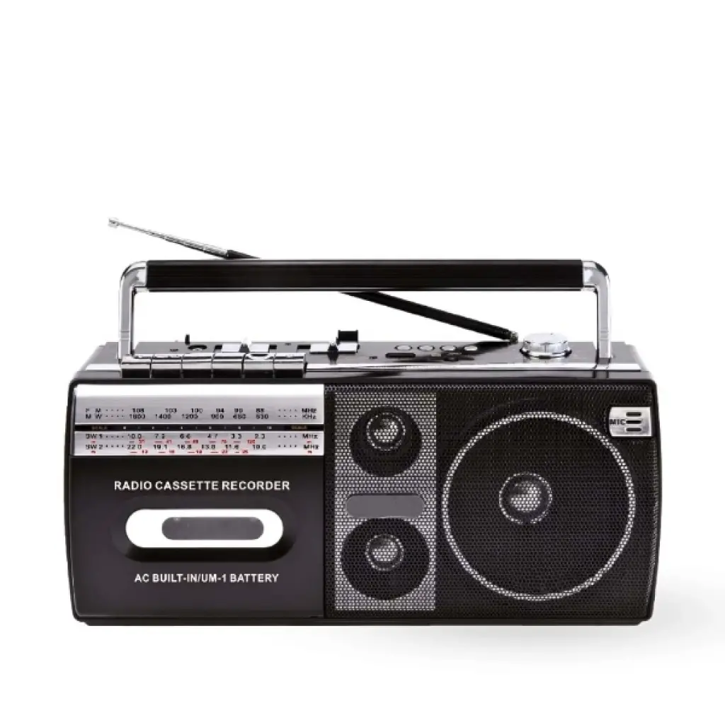 SİYAH KASET ÇALAR - BLUETOOTH USB TF AUX FM ÖZELLİKLİÜrün ÖzellikleriSiyah Kaset Çalar, klasik kaset çalar nostaljisini modern teknolojilerle bir araya getiren çok yönlü bir müzik sistemidir. Retro tasarımı, sade siyah rengi ve dayanıklı gövdesi ile hem dekoratif hem de kullanışlı bir ürün sunar. Çalışır durumdaki kaset oynatıcısı sayesinde geçmişteki kasetlerinizi yeniden dinleyebilir, güçlü hoparlör yapısı ile berrak ve yüksek ses performansı elde edebilirsiniz.Bluetooth desteği telefon, tablet ve bilgisayar gibi cihazlardan kablosuz müzik iletimi sağlar. USB ve TF kart girişleri dijital müzik arşivinizden kolayca içerik oynatmanıza olanak tanırken AUX girişi tüm uyumlu cihazlarla pratik bir bağlantı kurmanıza yardımcı olur. FM radyo özelliği güçlü sinyal yapısıyla sevdiğiniz radyo kanallarını net bir şekilde dinleme imkânı sunar.Taşıma kolu sayesinde kolayca taşınabilir yapıda olan bu kasetçalar hem ev hem ofis hem de açık alan kullanımında konforlu bir deneyim sağlar. Modern işlevsellik ile nostaljik bir ruh taşıyan bu ürün, çok yönlü ve dekoratif bir müzik sistemi arayan kullanıcılar için ideal bir tercihtir.Paket İçeriği1 Adet Siyah Kaset Çalar - Bluetooth USB TF AUX FM Özellikli