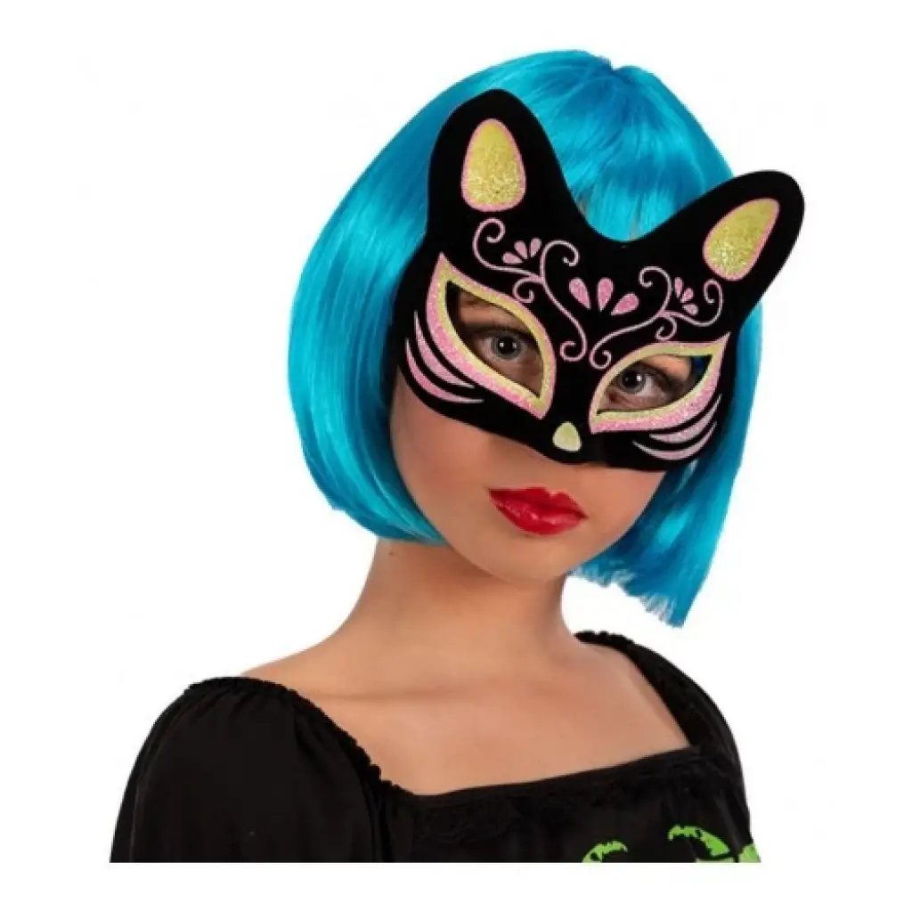 Siyah Süet Sarı Pembe Simli Kedi Maskesi