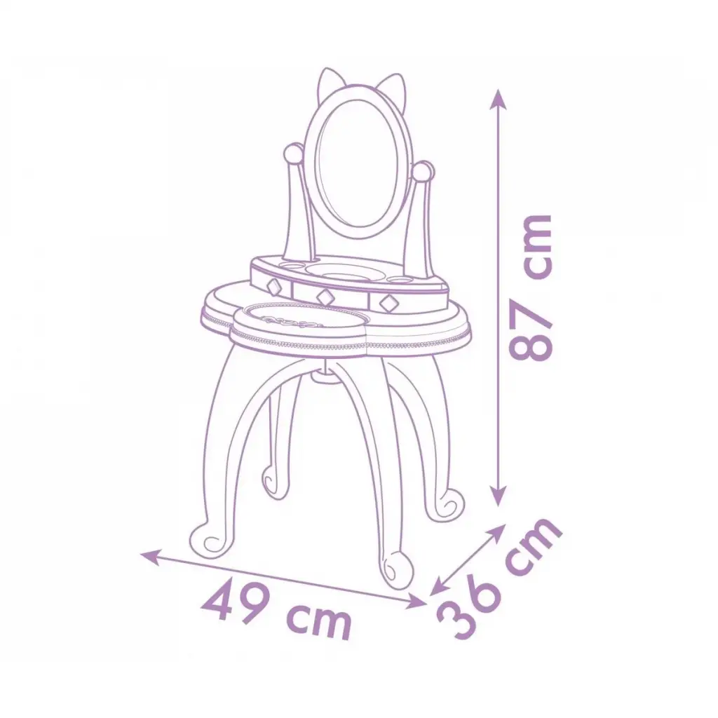 Sağlam tuvalet masası, modaya uygun okul öncesi serisi "Gabby's Dollhouse" tarzında tasarlanmıştır ve döner bir aynaya ve