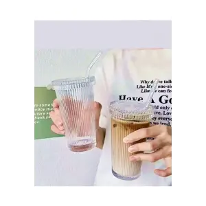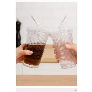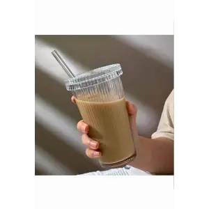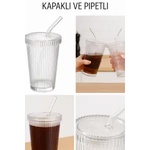 2 Adet Latte Kapaklı Pipetli Kristal Desen Fenomen Bardak Soğuk Kahve, Smoothie, İçecek Bardağı