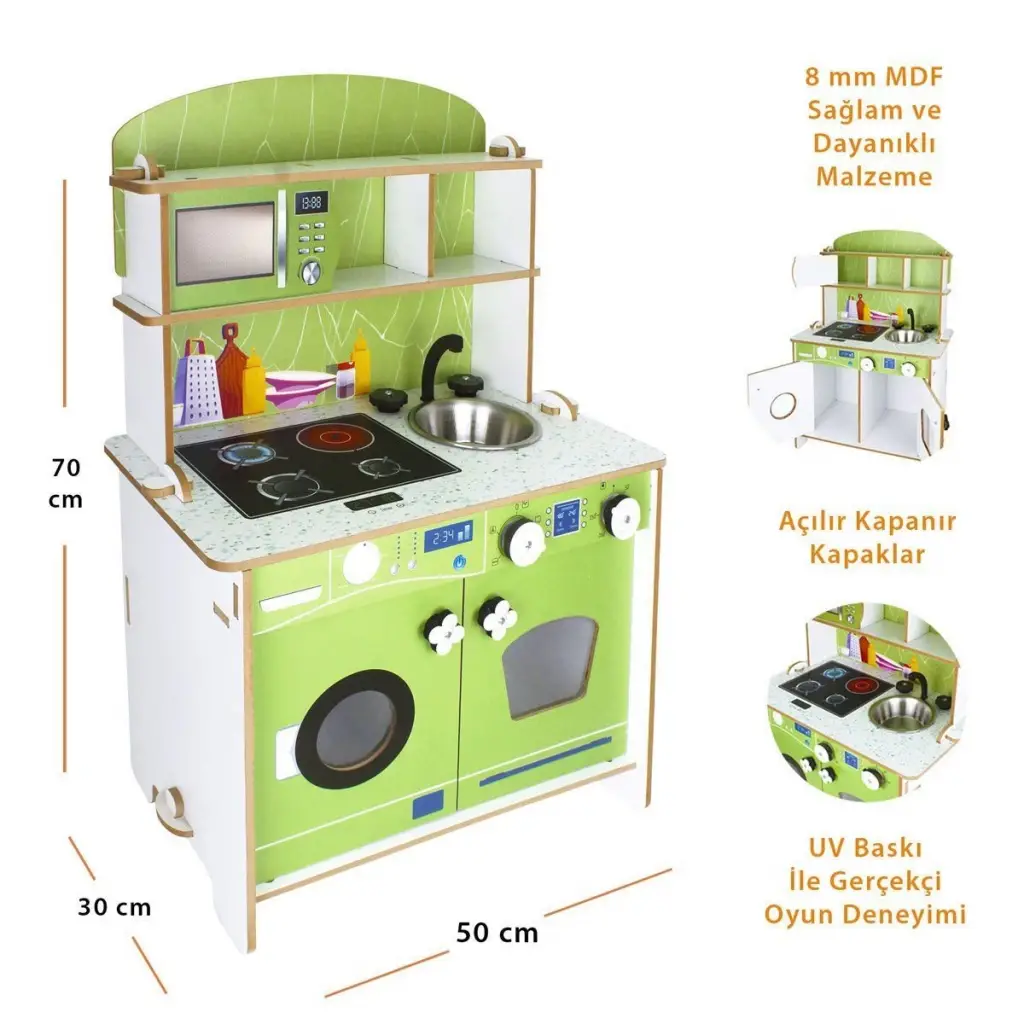 Ürün Açıklaması: Çocuklarınızın hayal gücünü ve yaratıcılığını geliştirecek olan bu Ahşap Çocuk Mutfağı, kaliteli ve sağlam 8 mm MDF malzemeden üretilmiştir.