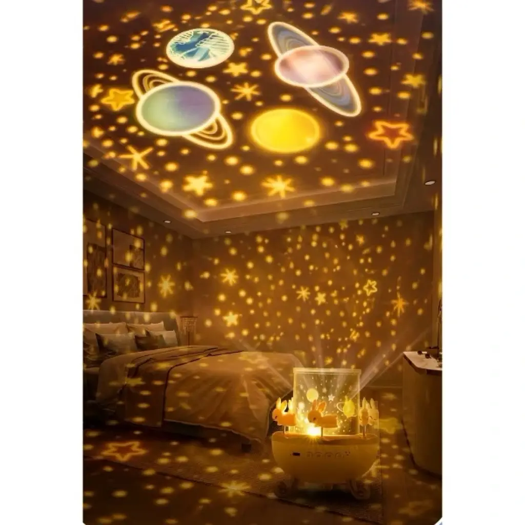 TAVŞAN ATLIKARINCA MULTİFONKSİYON PROJEKTÖRÜrün ÖzellikleriTavşan Atlıkarınca Multifonksiyon Projektör, müzik kutusu olarak da çalışabilen ve mobil cihazlar ile Bluetooth üzerinden müzik çalabilen bir üründür. Üst kısmındaki ve içteki tavşan figürleri döner, geceyi daha eğlenceli hale getirir. Cihaz, farklı ışık seviyeleri sunarak loş, orta ve güçlü aydınlatma seçenekleriyle ortamın aydınlatmasını değiştirir. Sıcak ışık, nötr ışık ve renkli ışık seçenekleriyle atmosferin tarzını değiştirebilirsiniz. Gökyüzü desenleri ve sevimli desenler içeren 12 farklı projeksiyon film diski sayesinde duvar ve tavana yıldızlar veya çeşitli desenler yansıtılabilir. USB ile şarj edilebilen bu projektör, bebek/çocuk odalarında kullanılabileceği gibi, gece lambası, uyku yardımcısı ya da hediye olarak da tercih edilebilir.Paket İçeriği1 Adet Tavşan Atlıkarınca Multifonksiyon Projektör