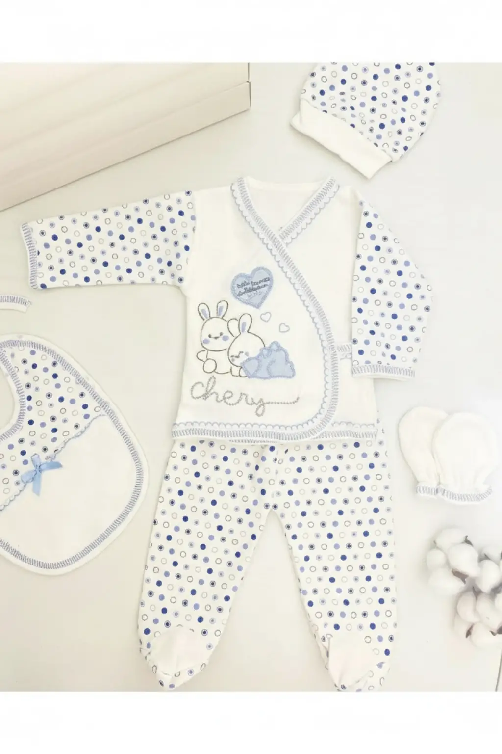 • 5 parçadan oluşan set; zıbın, tulum, eldiven, patik ve şapka içerir.