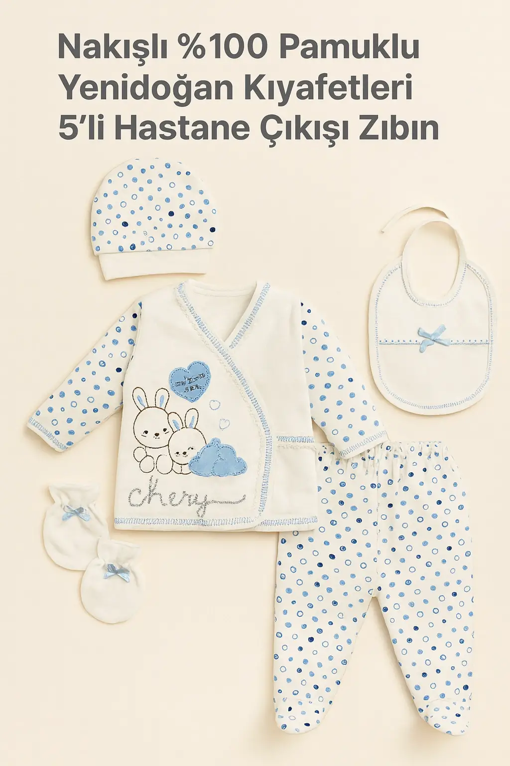 Yenidoğan bebeğiniz için şıklık ve konforu bir arada sunan Tavşan Nakışlı Desenli Pamuklu 5'li Hastane Çıkışı Zıbın Seti, Yumuşak pamuklu kumaştan üretilmiştir, bebeğinizin hassas cildine dosttur.