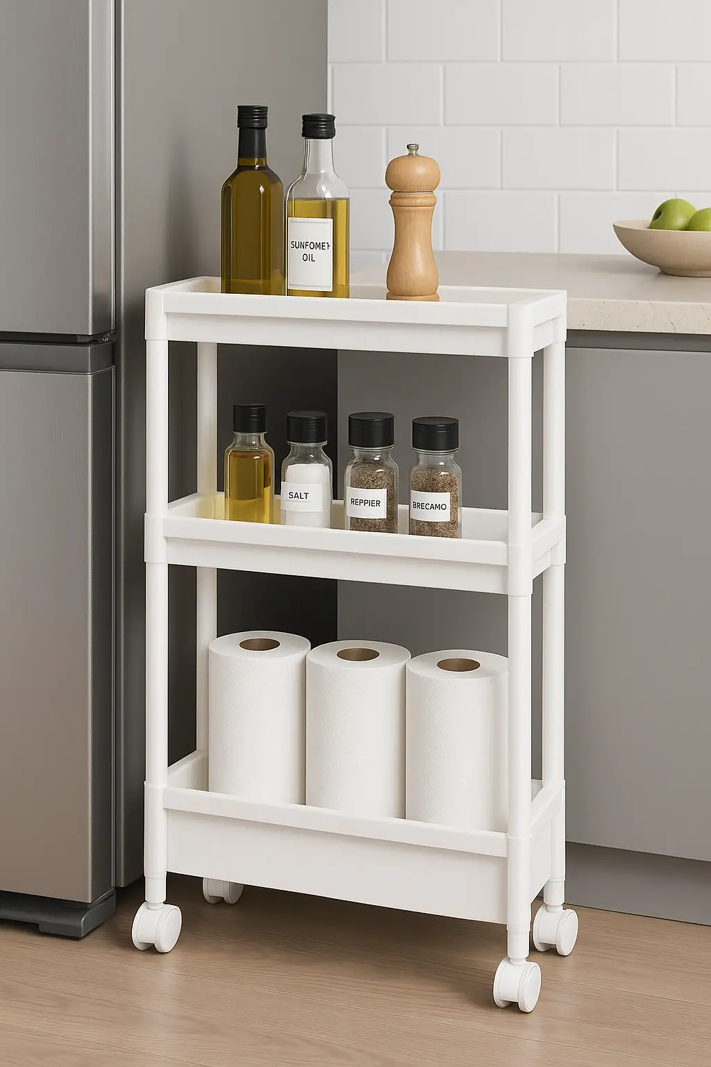 Dar Alan Uyumlu Tekerlekli 3 Katlı Mutfak Rafı ile mutfak düzeninizi sağlamak için hemen