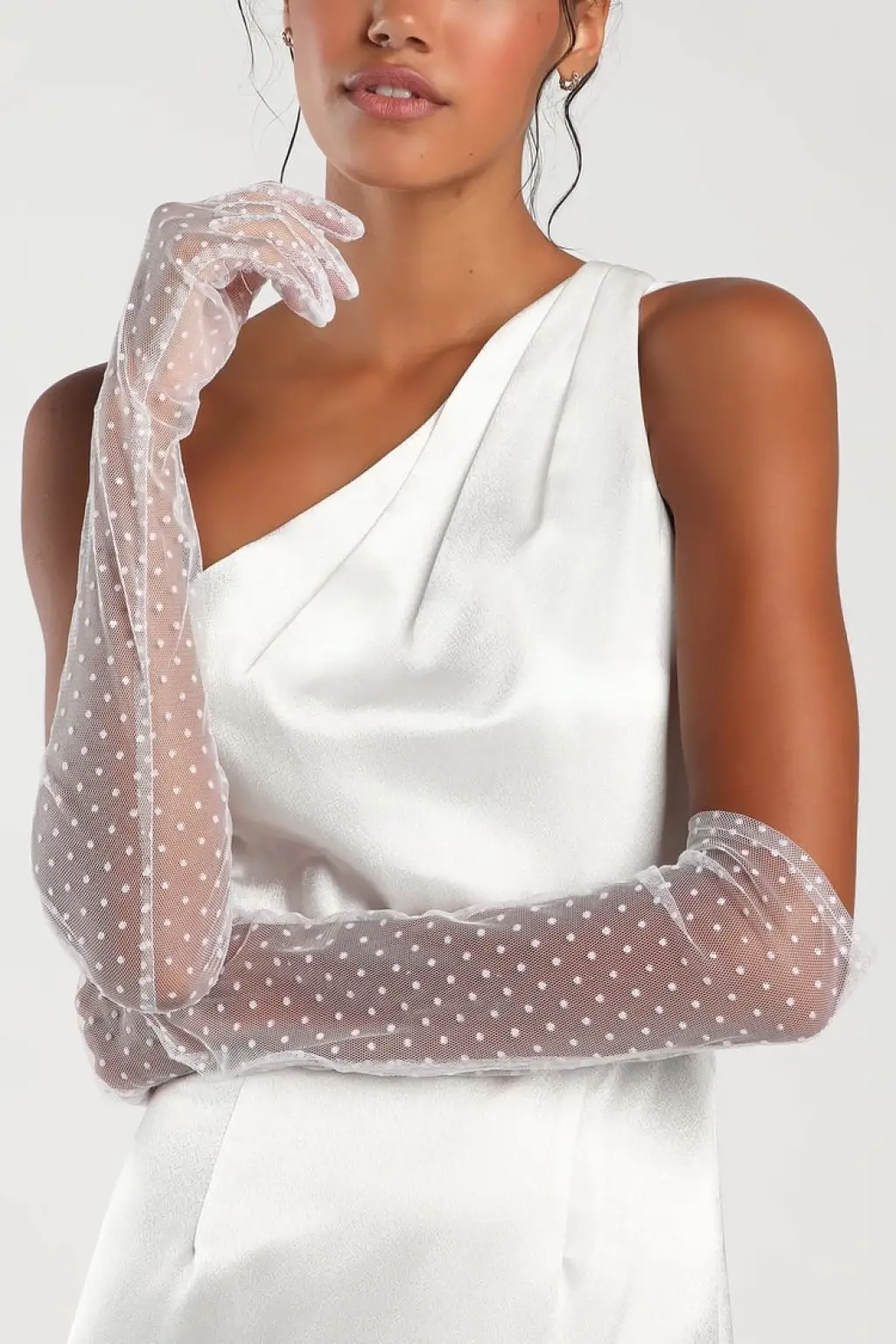 Uzun Boy Beyaz Puantiyeli Beyaz Renk Tül Eldiven