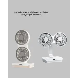 720° Dönebilen Çift Başlıklı USB Şarjlı Masaüstü Vantilatör – Sessiz ve Güçlü Serinlik