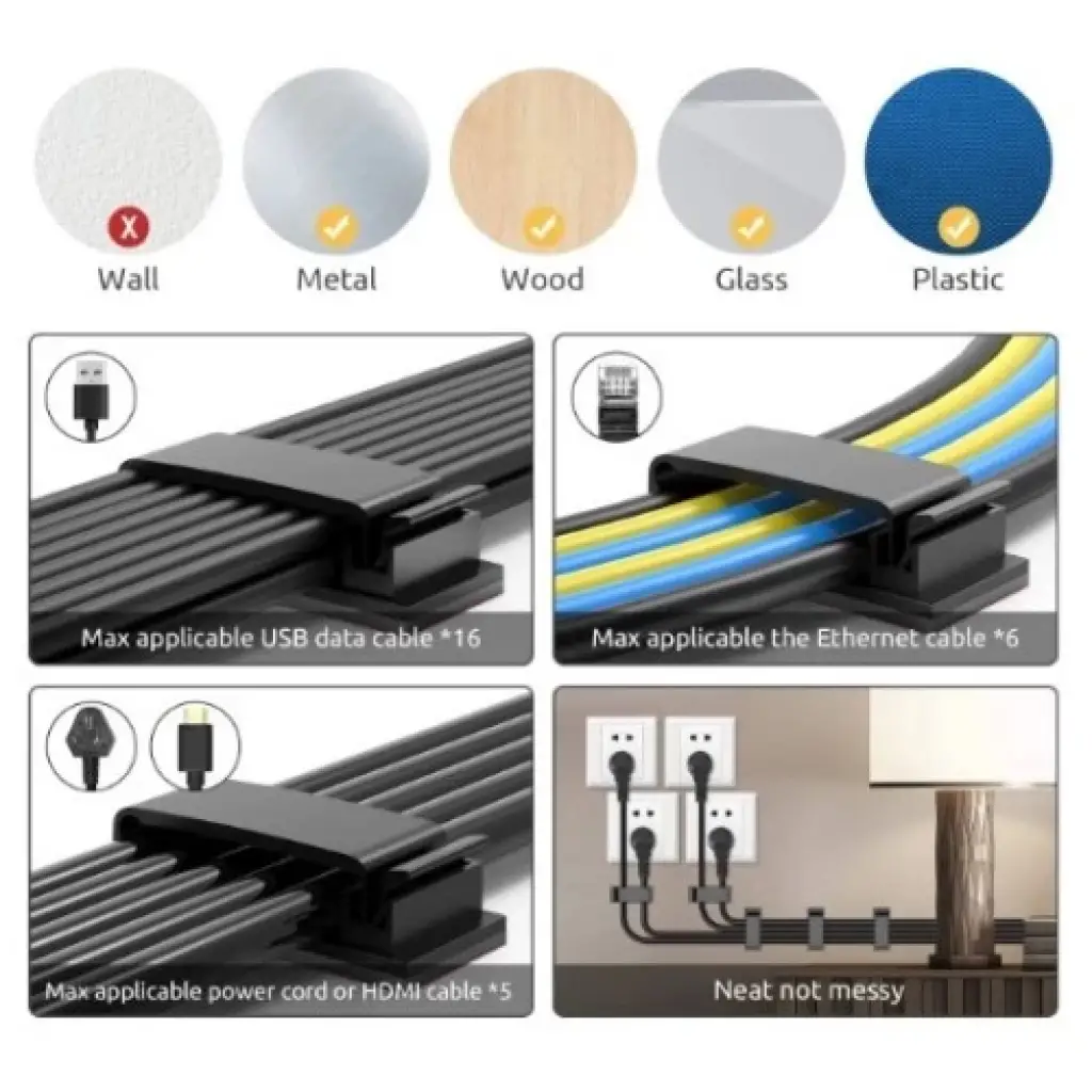 YAPIŞKANLI KABLO DÜZENLEYİCİ SET Plastik malzeme güçlü ve dayanıklıdır.Kabloları düzenlerken masaüstünün görünümünü etkilemez.Dağınık kabloların yönetilmesine ve daha rahat kullanılmasına izin verir.Yüksek kaliteli yapışkan bant kullanarak, cam, ahşap, seramik fayans ve diğer malzemeler üzerinde kullanılabilir.Paket içeriği : 4 Adet Yapışkanlı Kablo Düzenleyici KlipsRenk : SiyahÖlçüler : 19*11.4*45mm