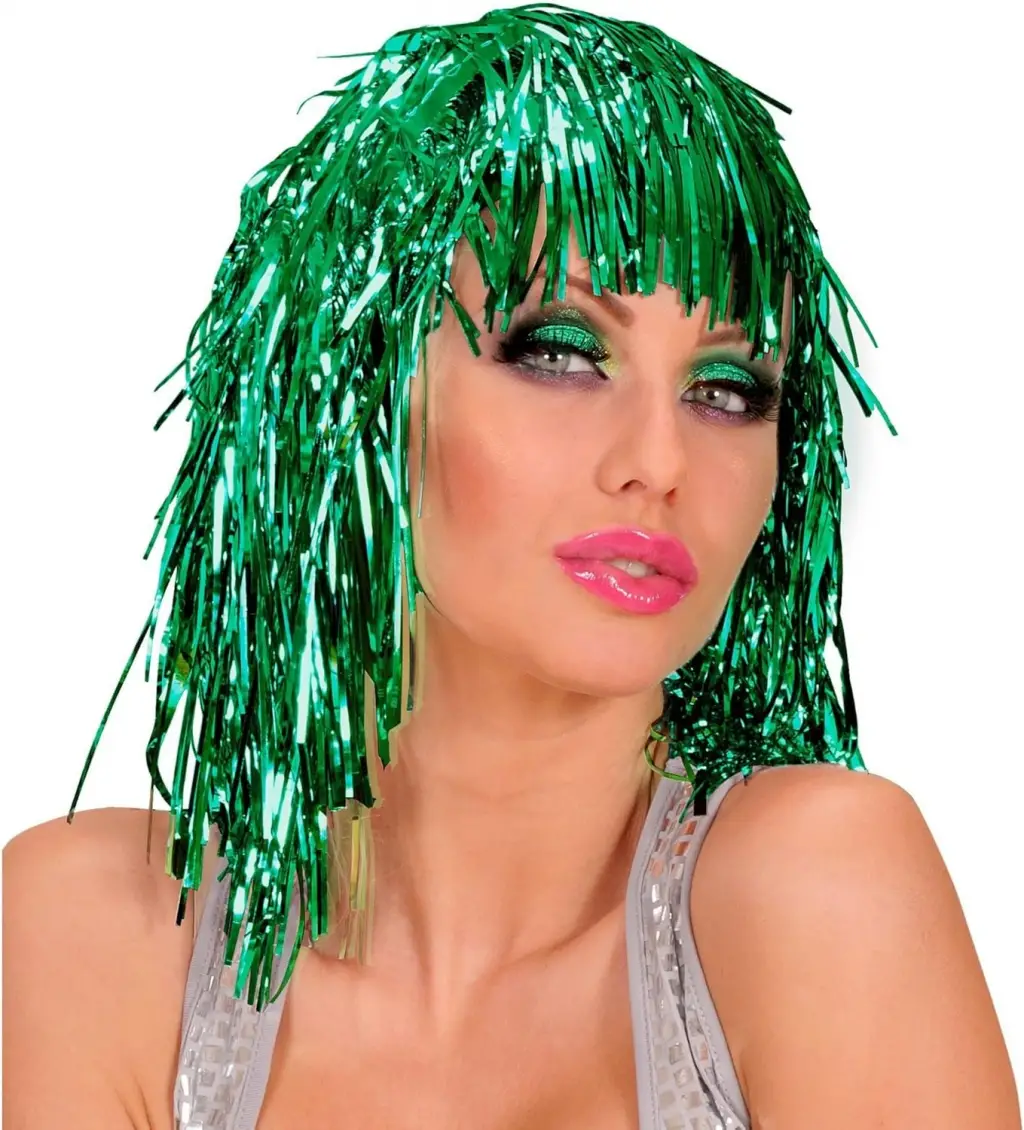 Parti tarzınıza enerji katın! Göz alıcı metalize yeşil peruk, parlak yapısıyla ışık altında mükemmel bir görünüm sağlar. Eğlenceli davetler, yılbaşı kutlamaları, doğum günleri ve sahne gösterileri için idealdir.
