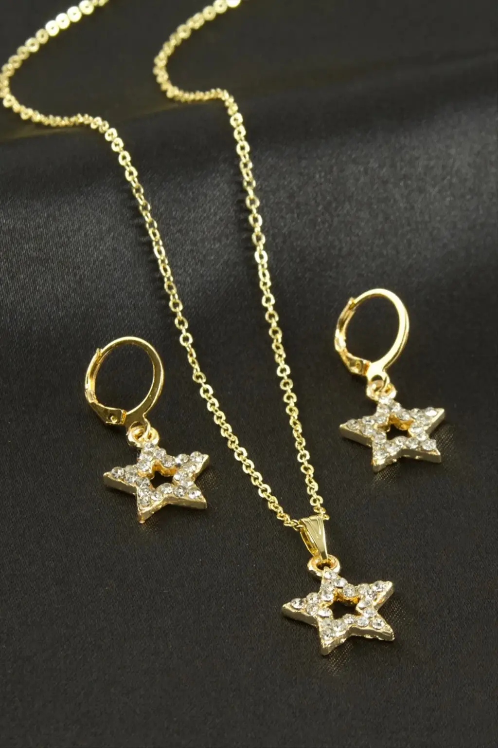 Kolye; Ürün malzemesi metal ve taştan üretilmiştir. 1 sınıf kaliteli malzeme kullanılmıştır. Ürün 1 adet kolye, ve 1 adet çift küpe vardır. Ürün zincir uzunluğu 45 santimdir. Ürün ucundaki taşlı aparat boyu 1,5 cmdir.