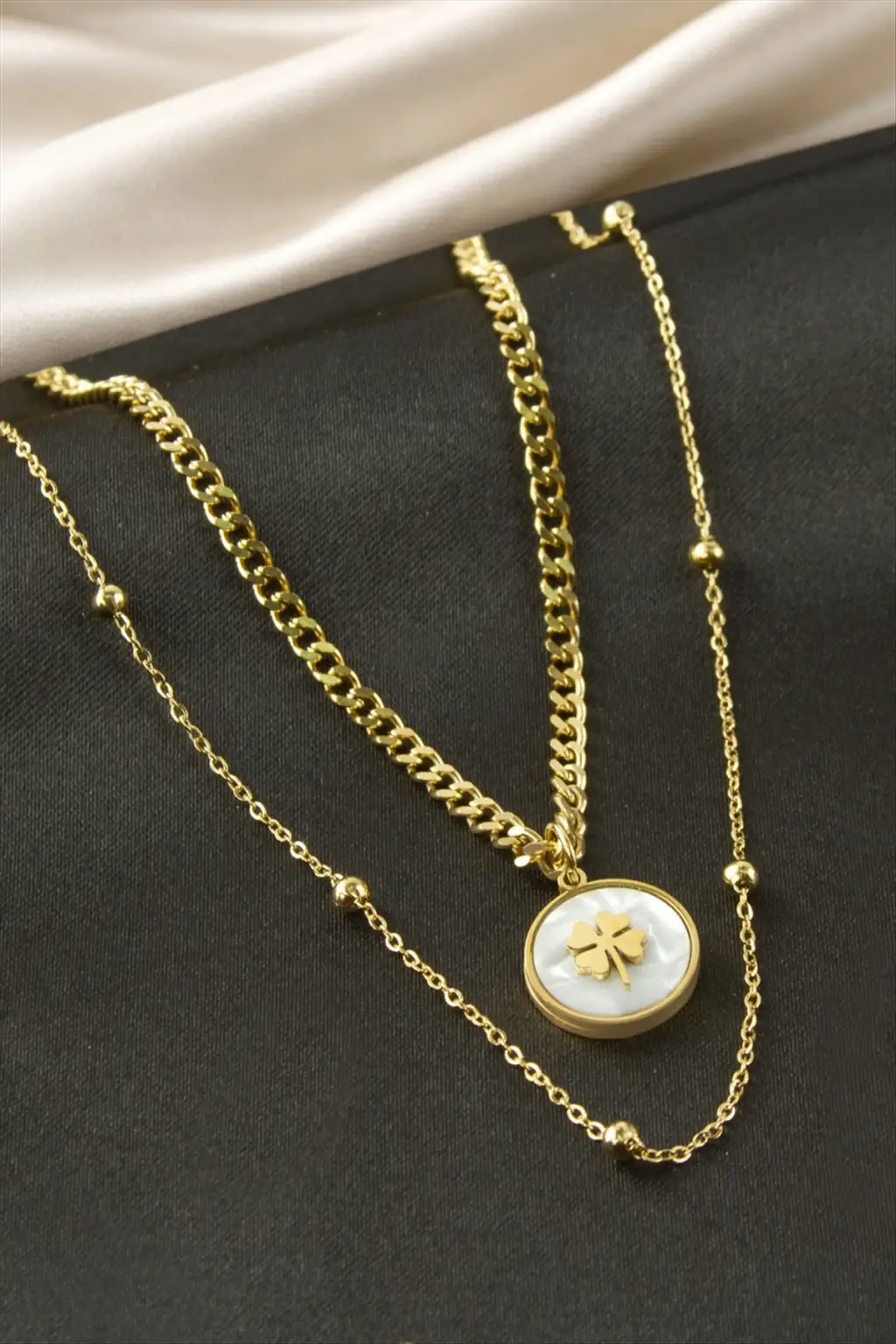 Kolye; Ürün malzemesi taş, sedef ve çeliktir. Çift zincir uzunluğu 55 cm ve ucundaki aparat boyu 1,5 cmdir. Kartlıdır. Kararma yapmaz.